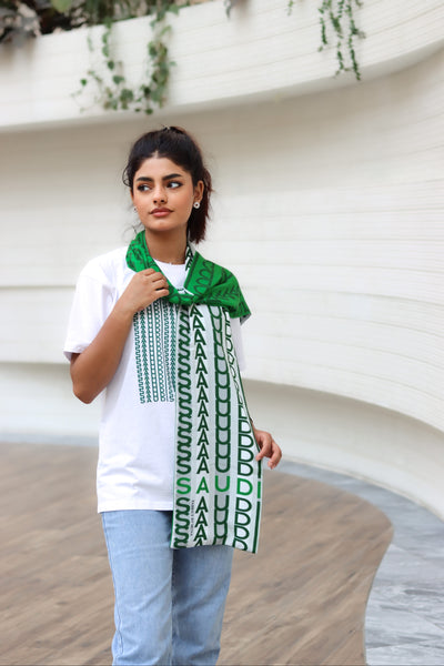 Exclusive fabric design with Saudi Monogram printed allover the scarf.