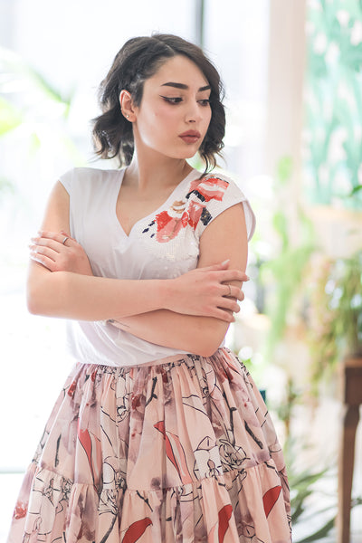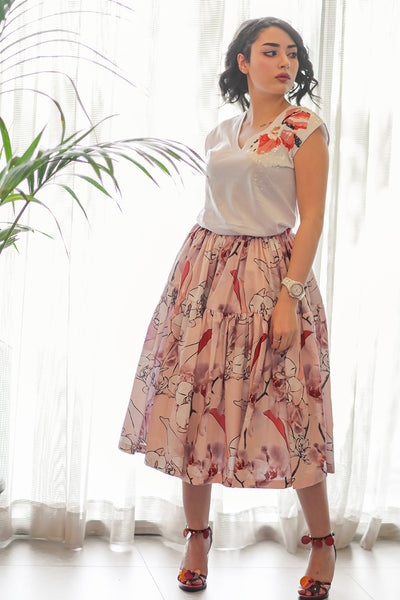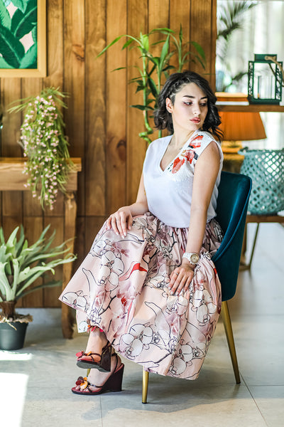 White t-Shirt with Orchid Embellishment and a skirt in a specially made fabric with allover Orchid design.